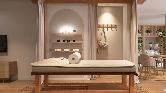 Vom Rohbau zum Wohlfühlraum. In diesem schweizer Wellness-Studio sollte es Platz geben für Meditationskurse, Massagen, eine Lounge für die Kursteilnehmer, eine kleine Ecke für Produktplatzierung, Fitnessgeräte und einen abgetrennten Bereich als Gästezimmer für Kursteilnehmer. All das in nur EINEM Raum! Hier war eine clevere Planung nötig, um den Platz optimal auszunutzen.