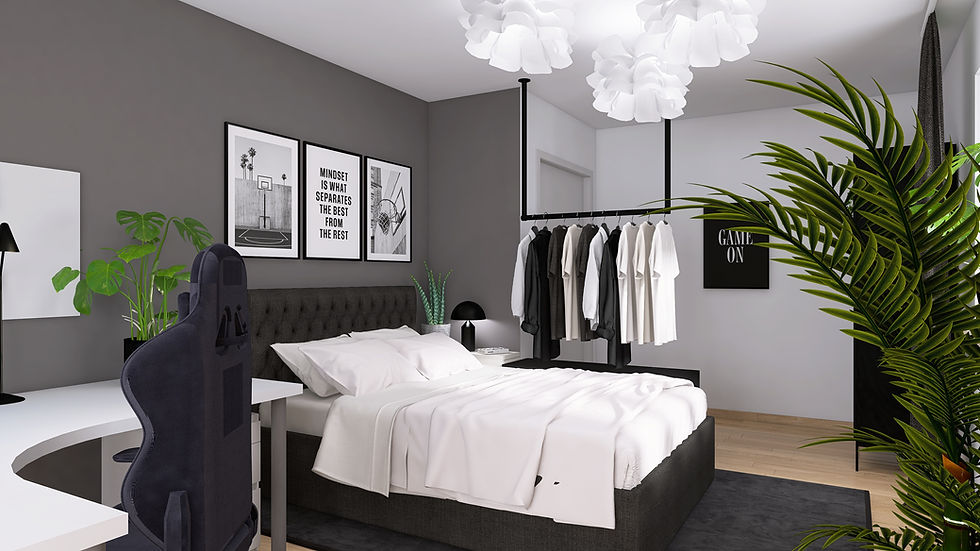 Dieses Teeniezimmer sollte den Besitzer wechseln: Schwester (14) raus, Bruder (16) rein! Und der mag es minimalistisch, clean und aufgeräumt. Aufgrund seiner Sehbehinderung haben wir hier auf starke Kontraste gesetzt, wie Schwarz und Weiß, die es ihm erleichtern, sich im Raum zu orientieren. Mit den Füßen lässt sich der flauschige Teppich ertasten, der die Position des Bettes markiert. Und was braucht jeder Teenager in seinem Zimmer? Genau: Privatsphäre! Deswegen ist die Kleiderstange so angebracht, das man beim Hineinkommen nicht sofort den ganzen Raum überblicken kann. Das neue Zimmer der Schwester findest du auch in unseren Home Projekten unter dem Namen #holdon.